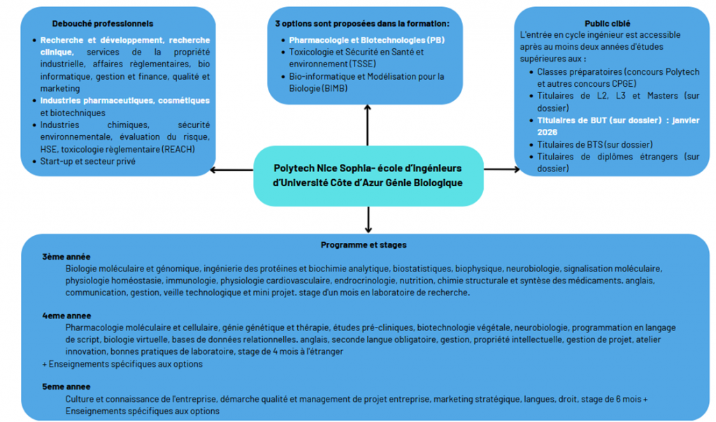 Parmi les formations possibles, l’école d’ingénieur qui attire le plus mon attention fait partie du réseau Polytech, en option Génie Biologique, proposée à Clermont, Montpellier, et Orléans mais plus particulièrement celle de Nice Sophia, que je présente ici :